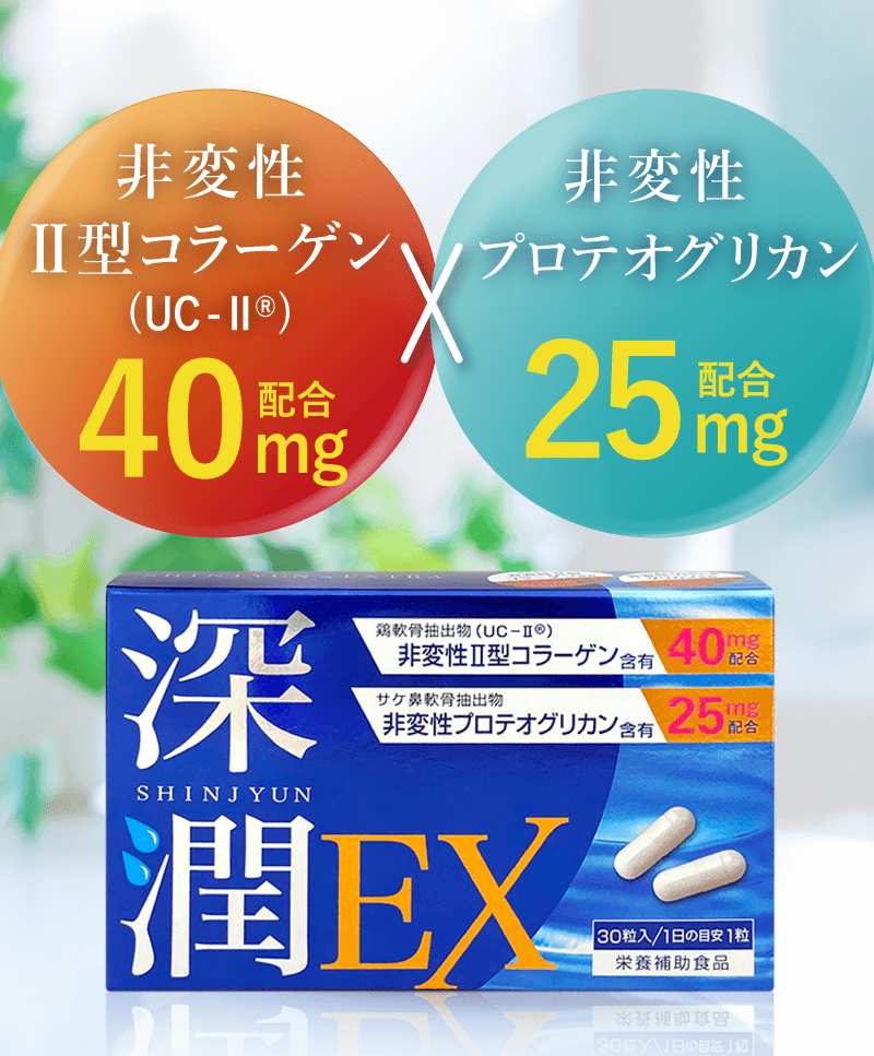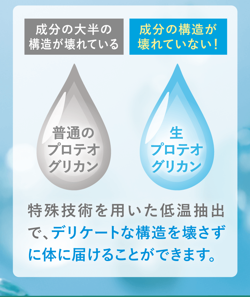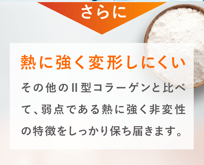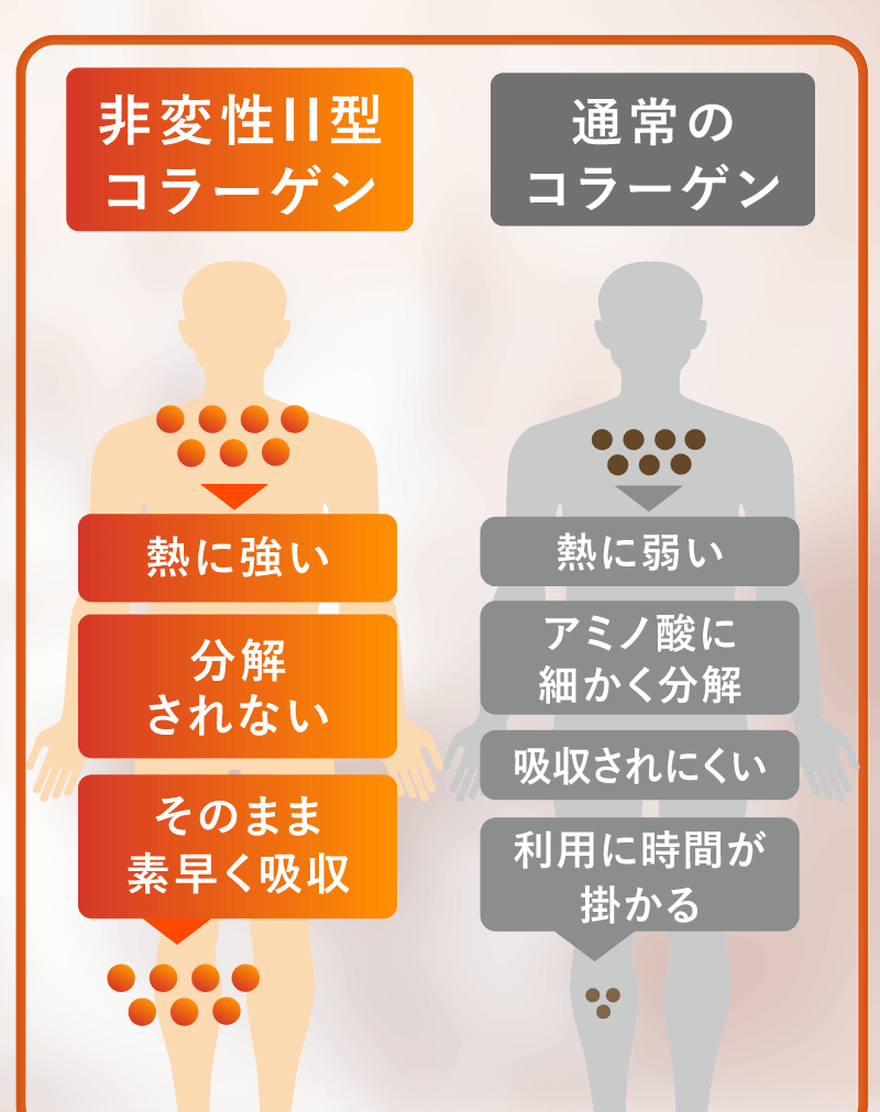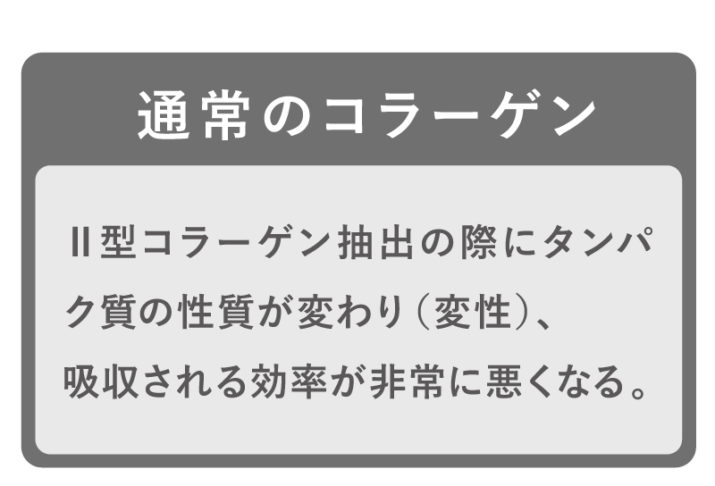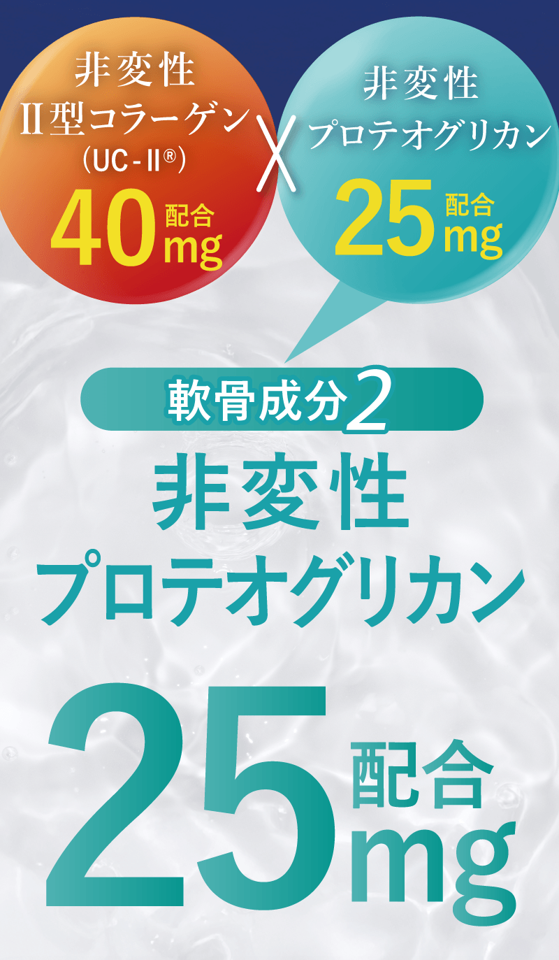 軟骨を構成する成分は、水分を除くと約75%がⅡ型コラーゲン、約15%がプロテオグリカンです。 これらの成分はバラバラに壊れてしまうと意味がなく、それぞれ独特の形を維持している必要があります。 グルコサミンやコンドロイチンは、Ⅱ型コラーゲンやプロテオグリカンを構成する部品です。 当社ではⅡ型コラーゲンとプロテオグリカンを体内で存在する形と同じ状態で摂取していただくことが有用と考えておりますので、 形が壊れていない「非変性」で配合しています。