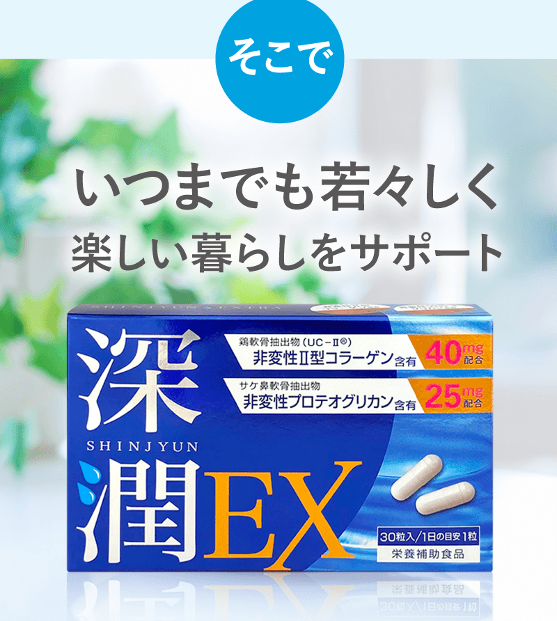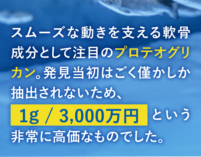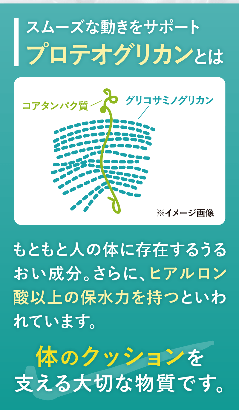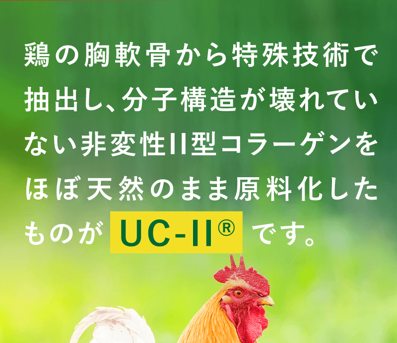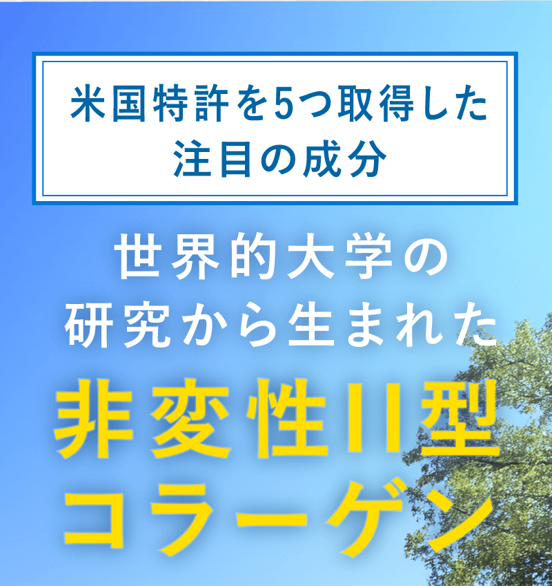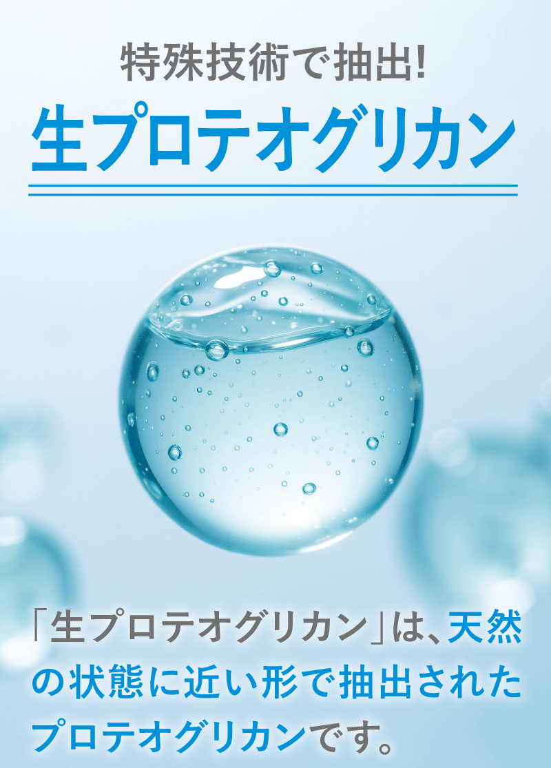 軟骨を構成する成分は、水分を除くと約75%がⅡ型コラーゲン、約15%がプロテオグリカンです。 これらの成分はバラバラに壊れてしまうと意味がなく、それぞれ独特の形を維持している必要があります。 グルコサミンやコンドロイチンは、Ⅱ型コラーゲンやプロテオグリカンを構成する部品です。 当社ではⅡ型コラーゲンとプロテオグリカンを体内で存在する形と同じ状態で摂取していただくことが有用と考えておりますので、 形が壊れていない「非変性」で配合しています。