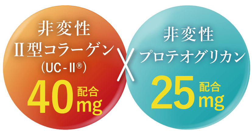 軟骨を構成する成分は、水分を除くと約75%がⅡ型コラーゲン、約15%がプロテオグリカンです。 これらの成分はバラバラに壊れてしまうと意味がなく、それぞれ独特の形を維持している必要があります。 グルコサミンやコンドロイチンは、Ⅱ型コラーゲンやプロテオグリカンを構成する部品です。 当社ではⅡ型コラーゲンとプロテオグリカンを体内で存在する形と同じ状態で摂取していただくことが有用と考えておりますので、 形が壊れていない「非変性」で配合しています。