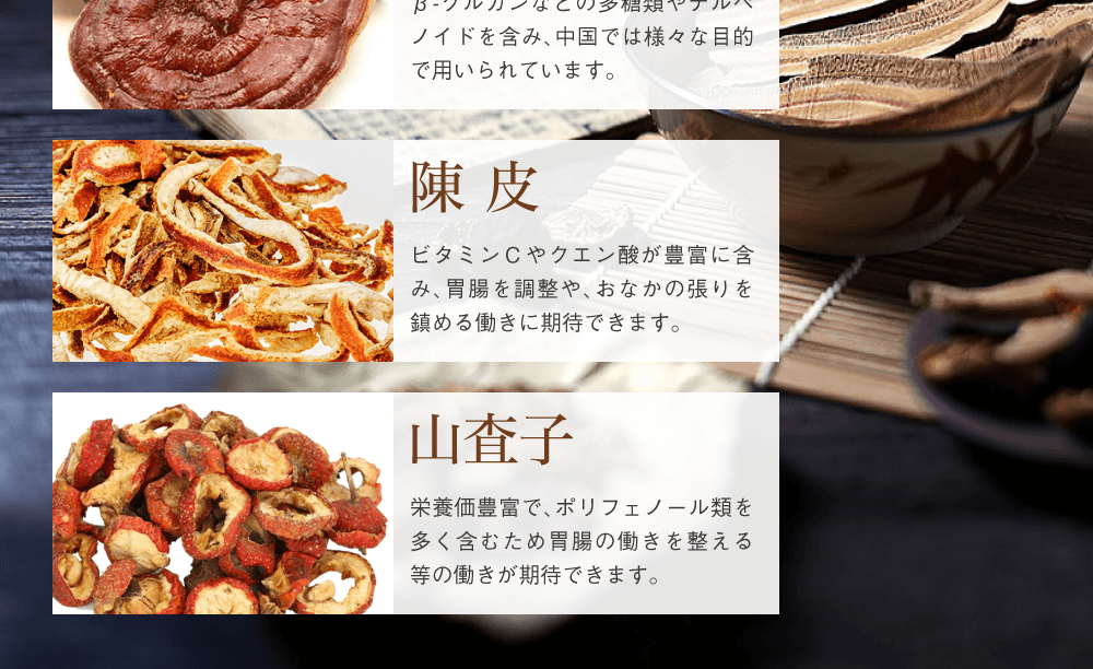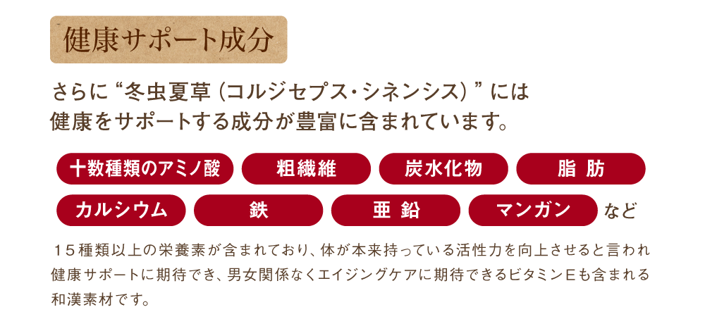 冬虫夏草菌糸体末、還元麦芽糖水飴、霊芝末、チンピ末、サンザシ末、ゼラチン、ステアリン酸Ca、微粒酸化ケイ素、(原材料の一部に豚肉を含む)